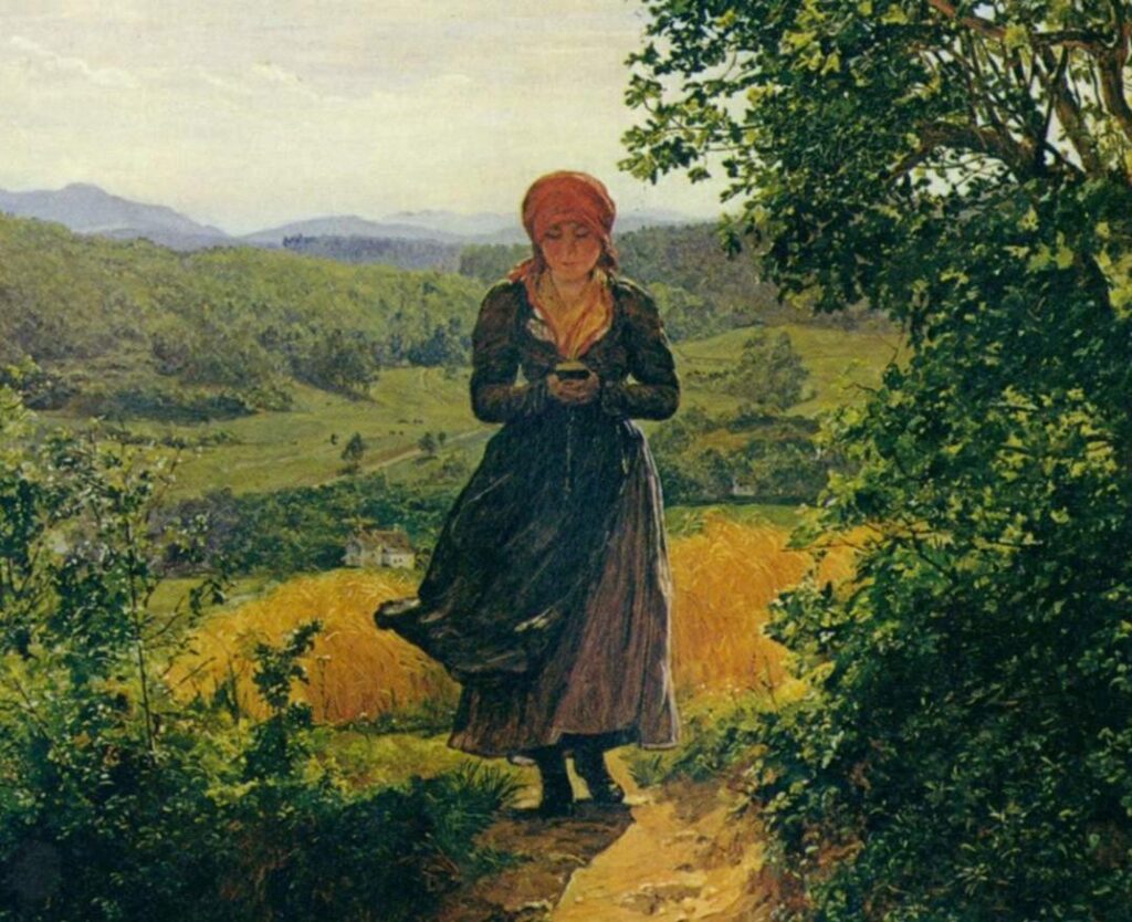 „Does Ferdinand Georg Waldmuller’s 1860 painting ‚The Expected One‘ show a young woman walking along, staring at her smartphone?“